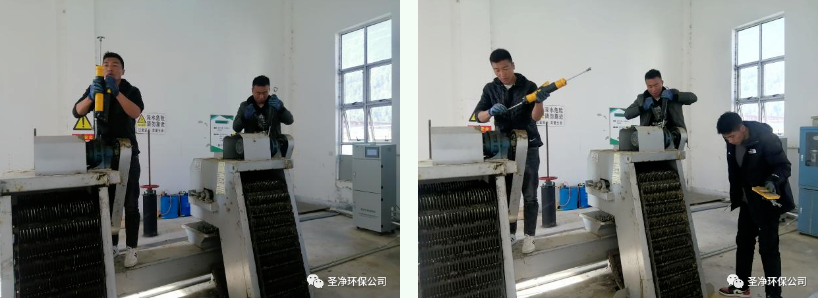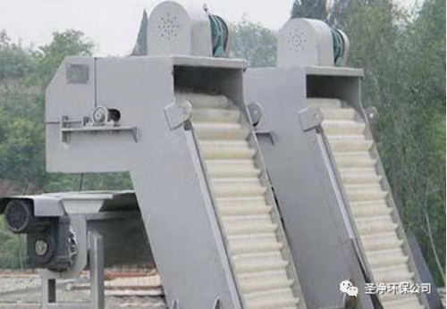 耙齒鏈運轉(zhuǎn)到設(shè)備的上部時,由于槽輪和彎軌的導向,使每組耙齒之間產(chǎn)生相對自清運動,絕大部分固體物質(zhì)靠重力落下。另一部分則依靠清掃器的反向運動把粘在耙齒上的雜物清掃干凈。