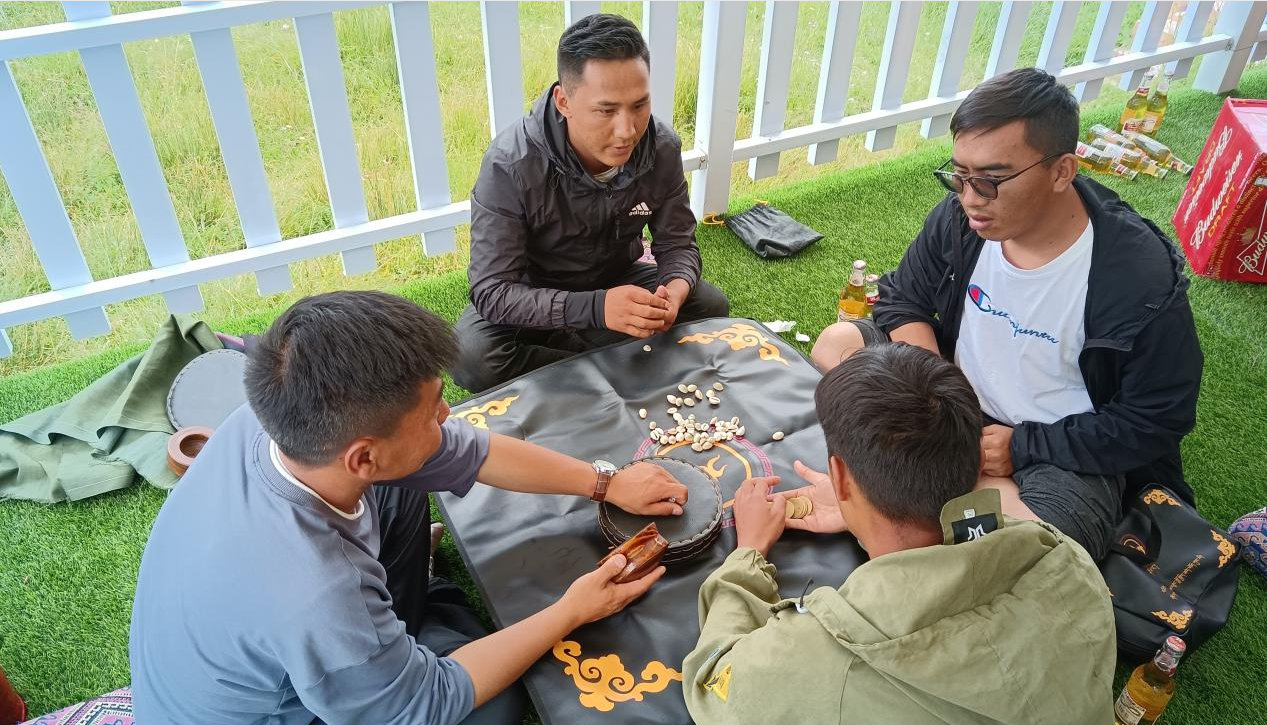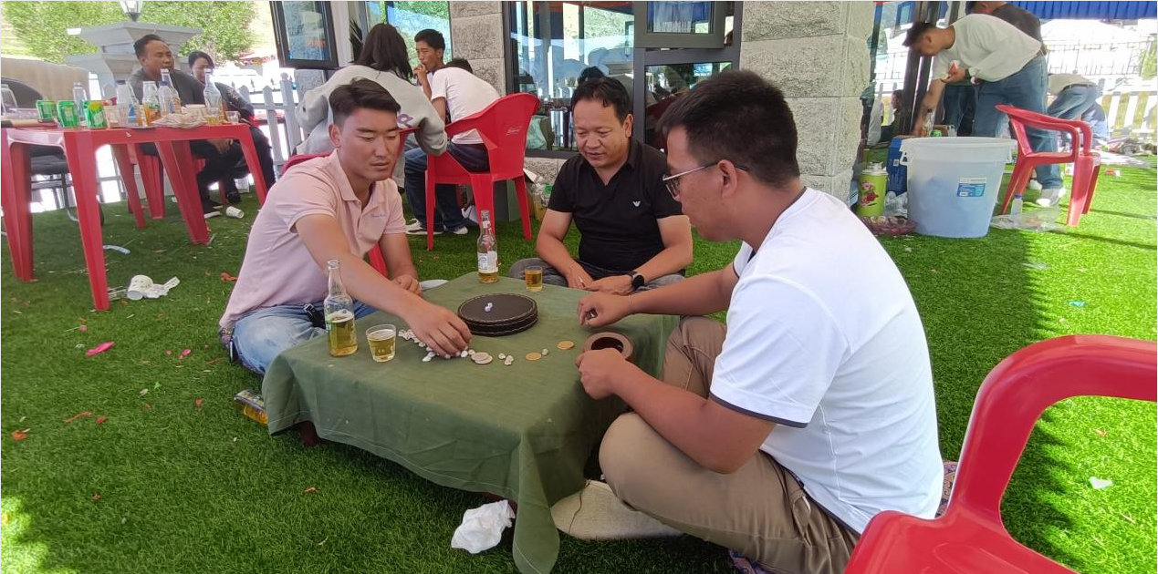 第二天大家?guī)е囡坪退钟筒杓案鞣N美食紛紛圍坐在一起,唱歌、跳舞、打藏牌、擲骰子、講故事、玩游戲、喝酒狂歡。